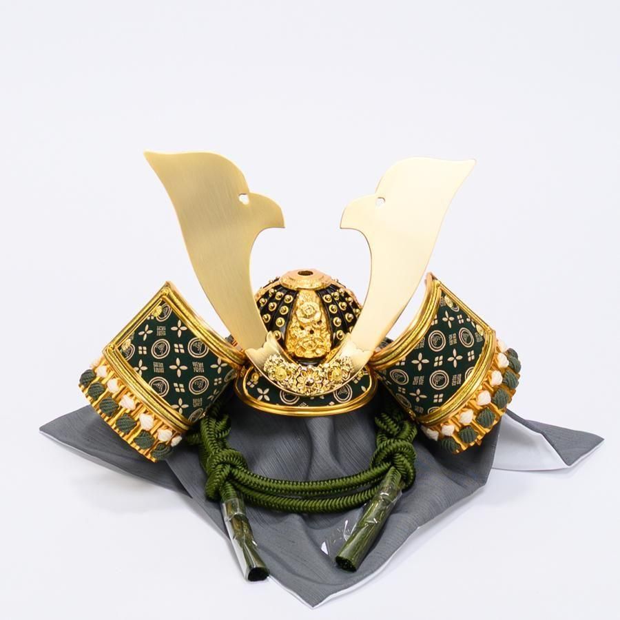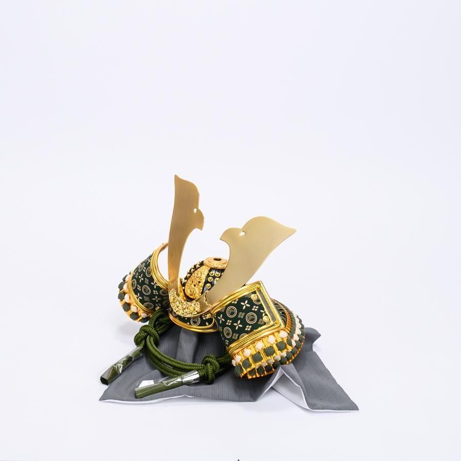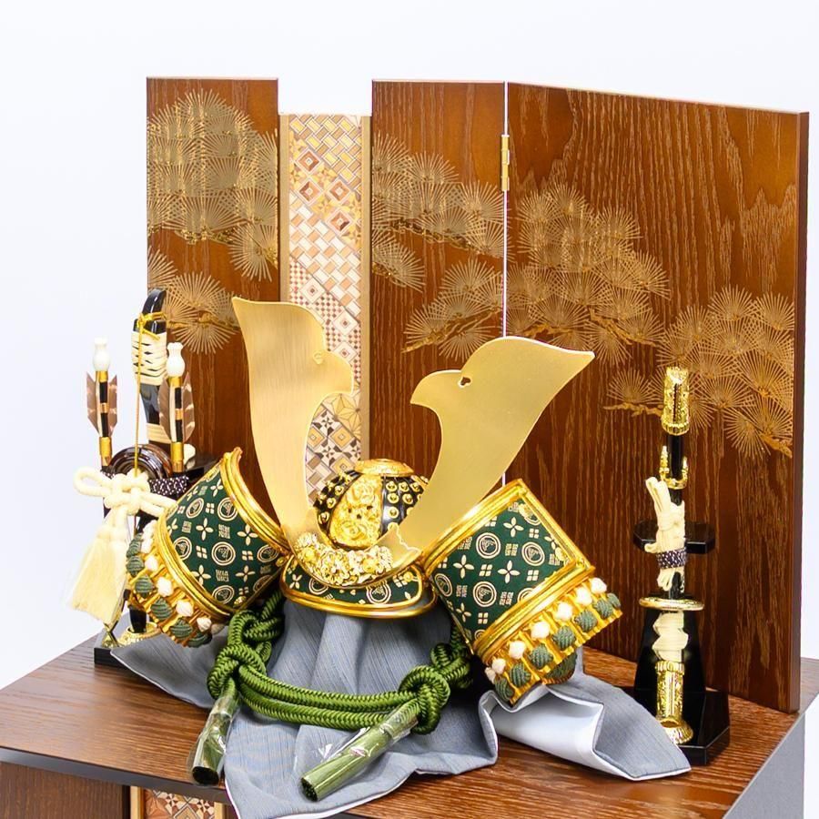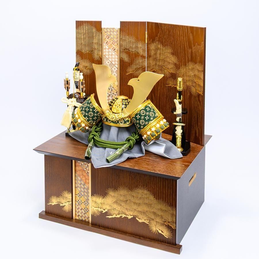 甲州印伝緑富士山柄 8号深川緑大鍬型兜 オーク寄せ木収納飾りセット