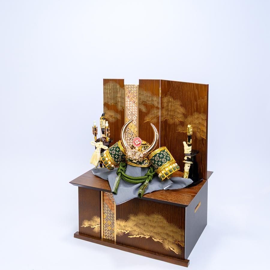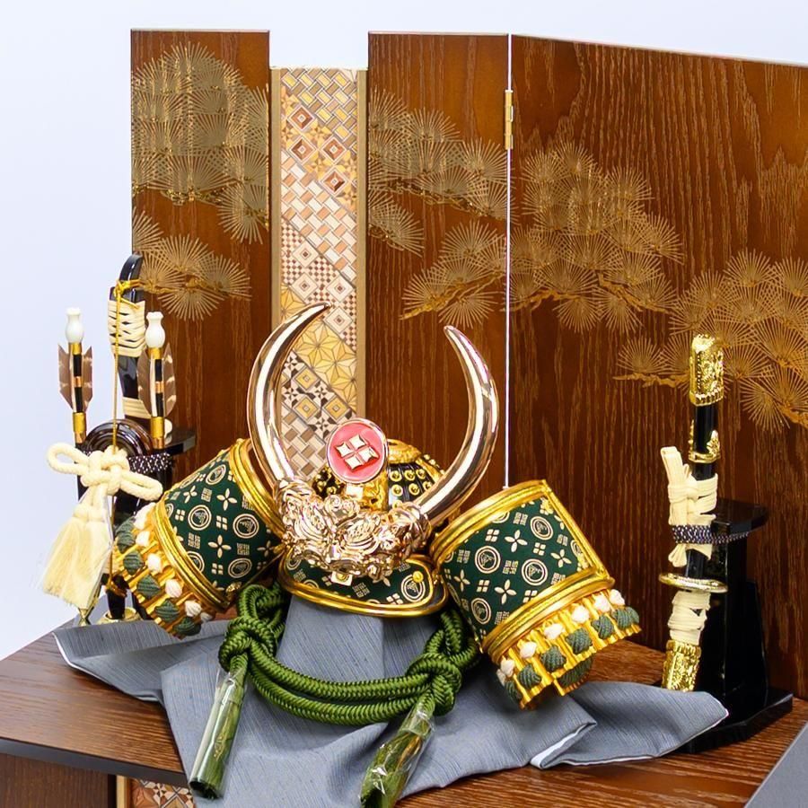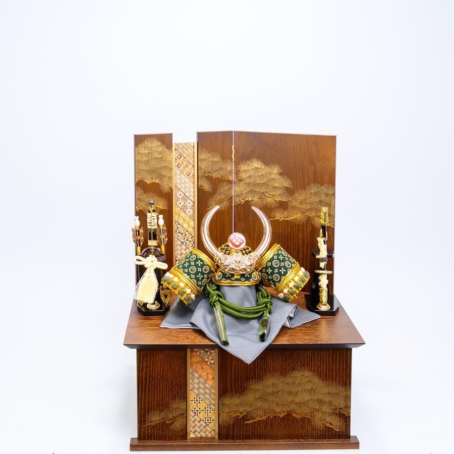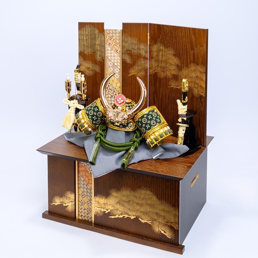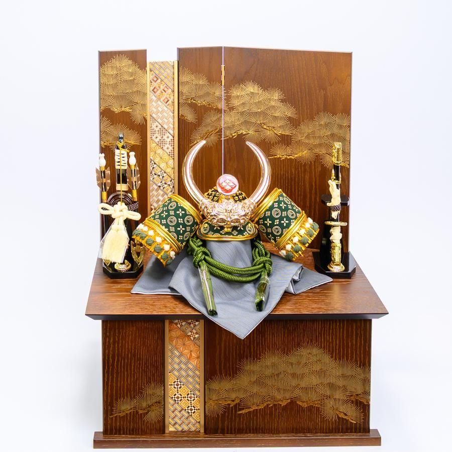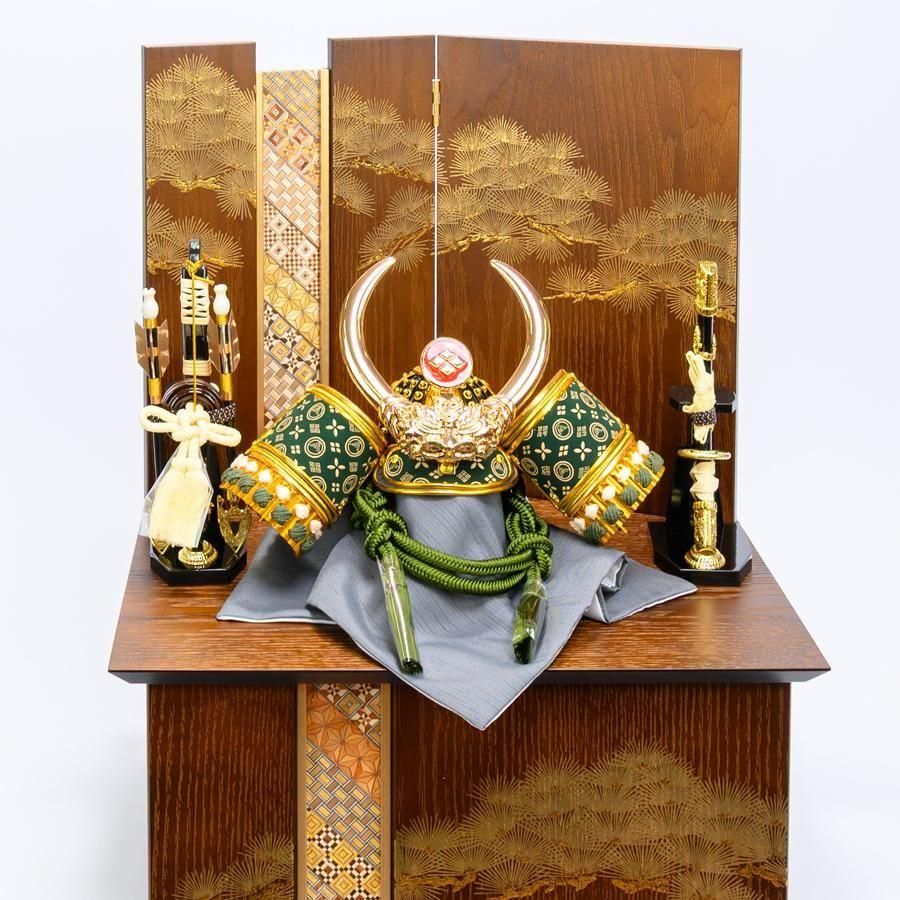 甲州印伝緑富士山柄 8号深川緑武田信玄兜 オーク寄せ木収納飾りセット