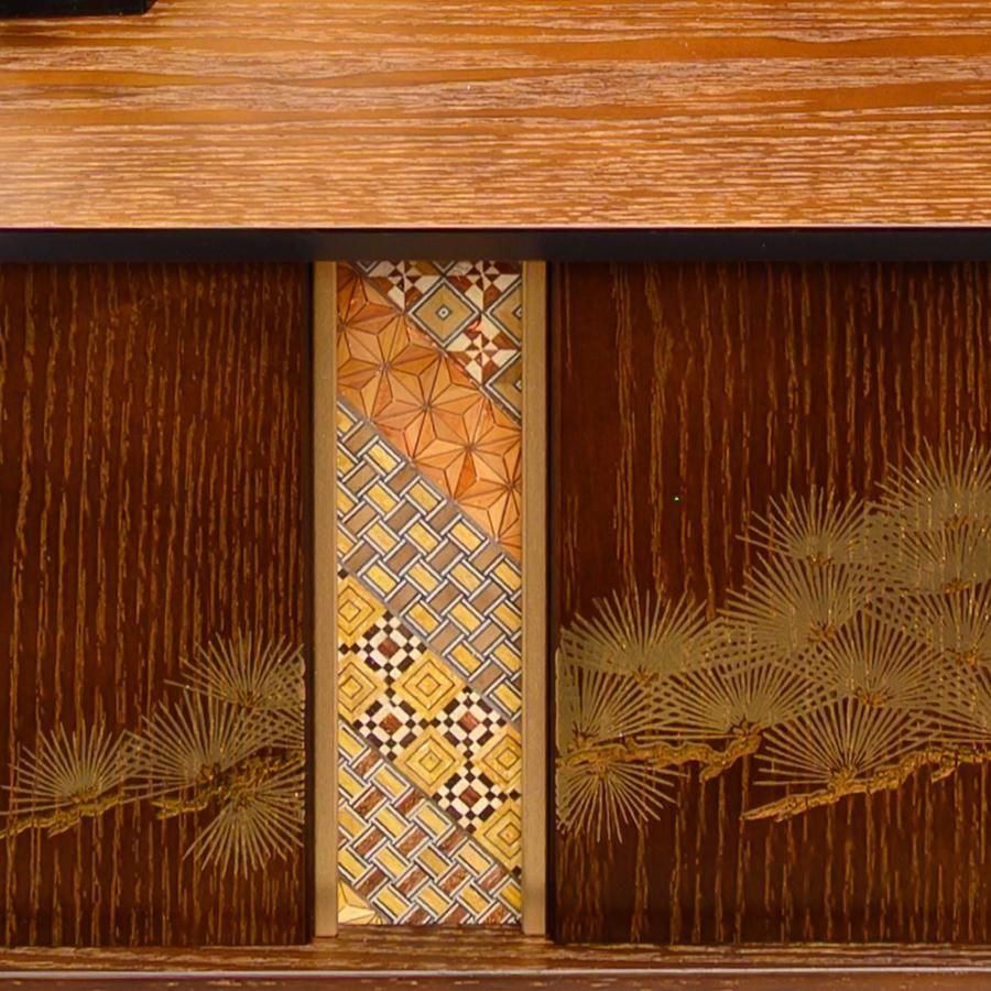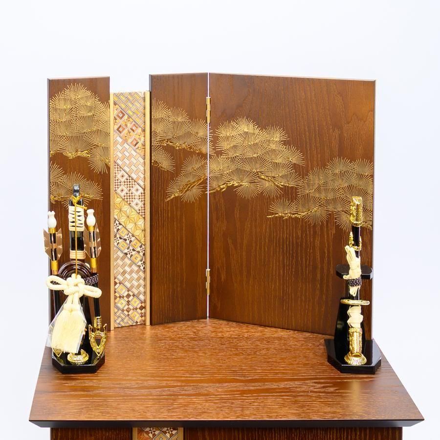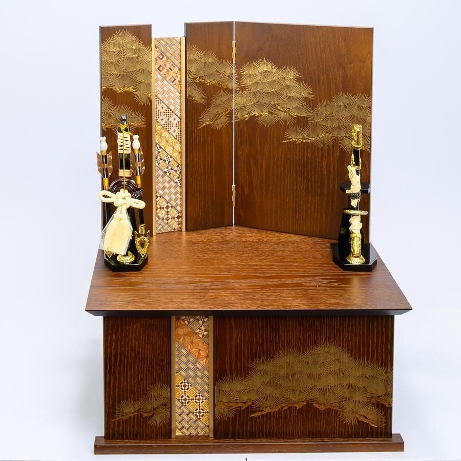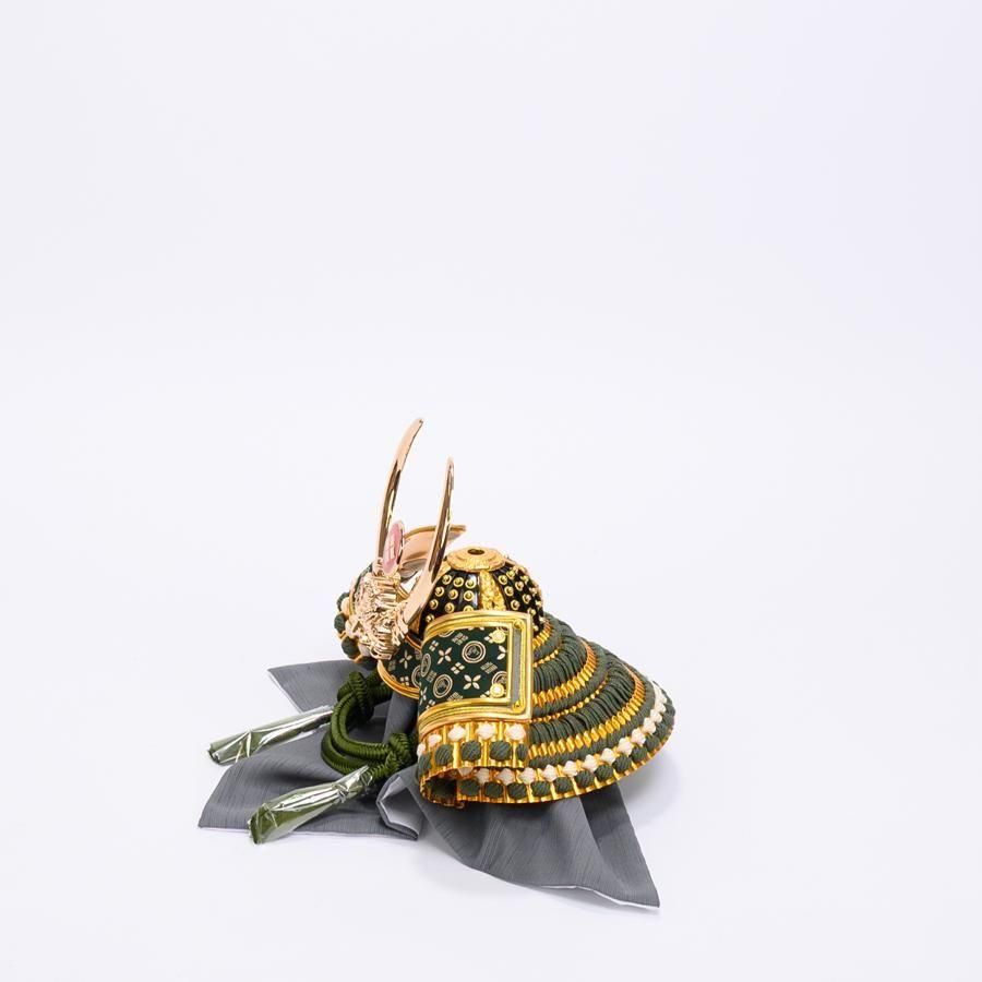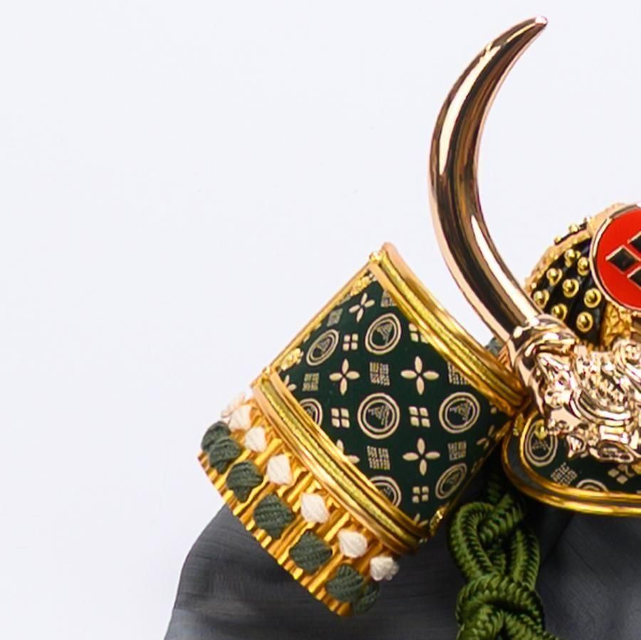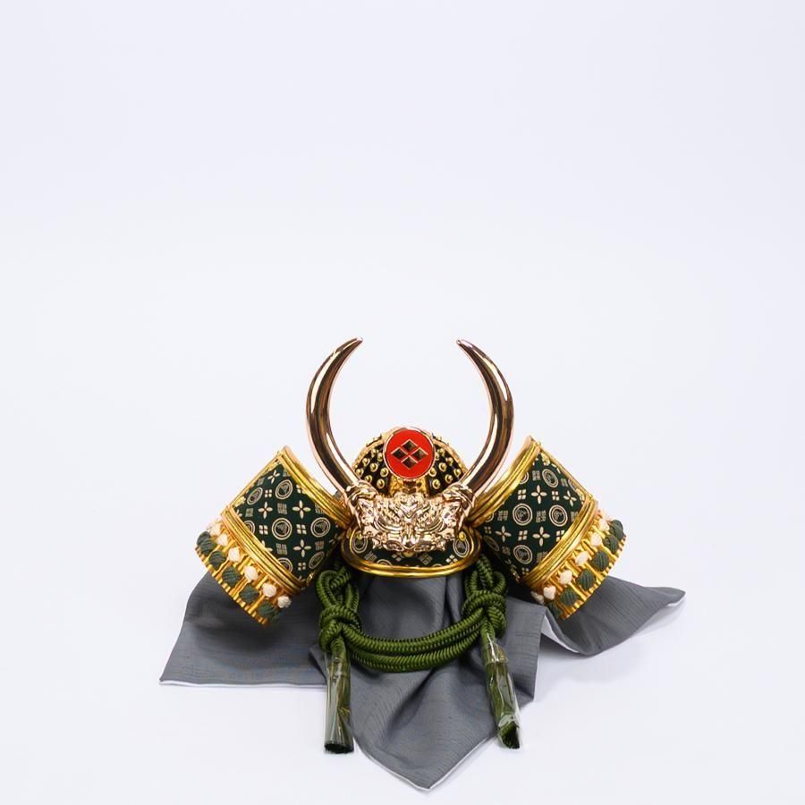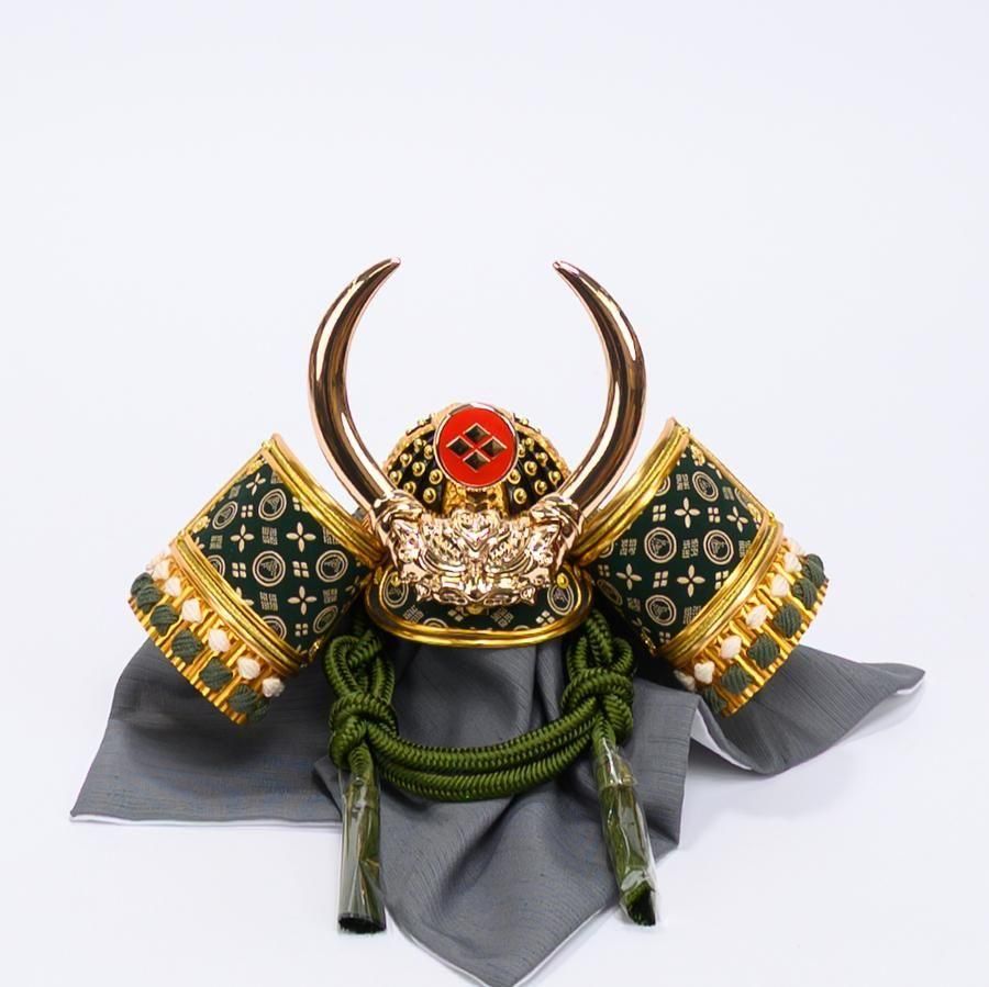 甲州印伝緑富士山柄 8号深川緑武田信玄兜 オーク寄せ木収納飾りセット